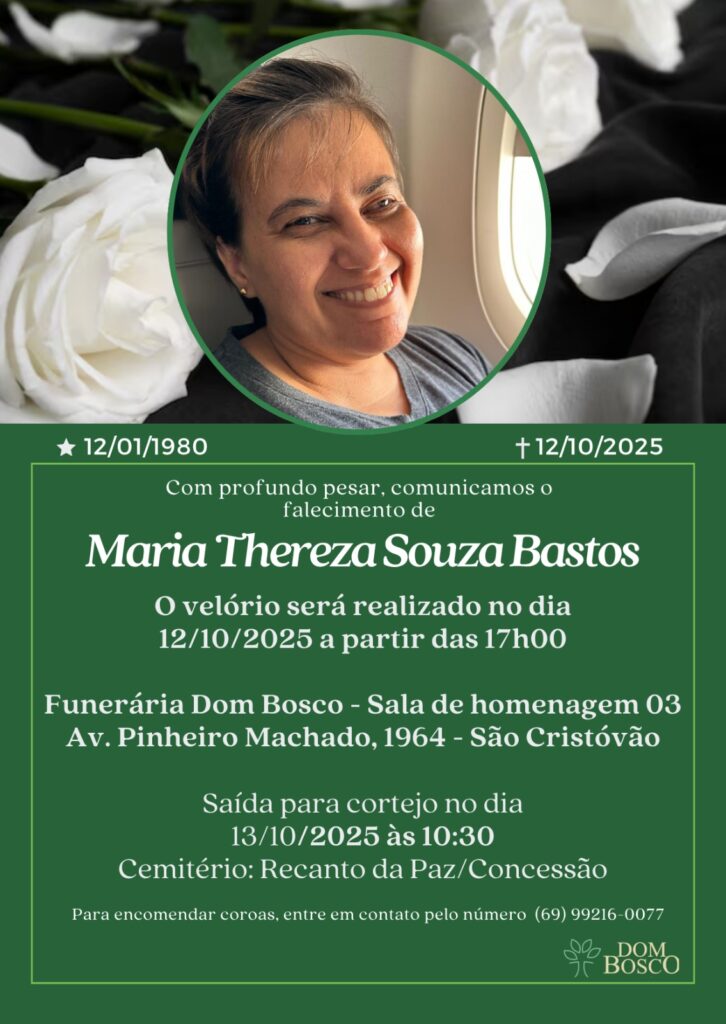 A Associação dos Docentes da Universidade Federal de Rondônia (ADUNIR) manifesta, com profundo pesar, o falecimento de Maria Thereza Souza Bastos, filha do professor Wanderley Bastos, docente da Geografia da UNIR. Neste momento de imensa dor, nos solidarizamos com o colega e sua família, expressando nossas mais sinceras condolências por essa perda tão significativa.