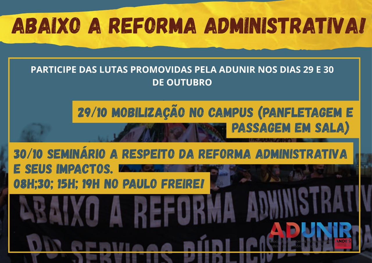 Nos dias 29 e 30 de outubro, a ADUNIR promove uma série de atividades em defesa do serviço público e contra a Reforma Administrativa, que ameaça direitos das servidoras e servidores e compromete a qualidade dos serviços oferecidos à população.