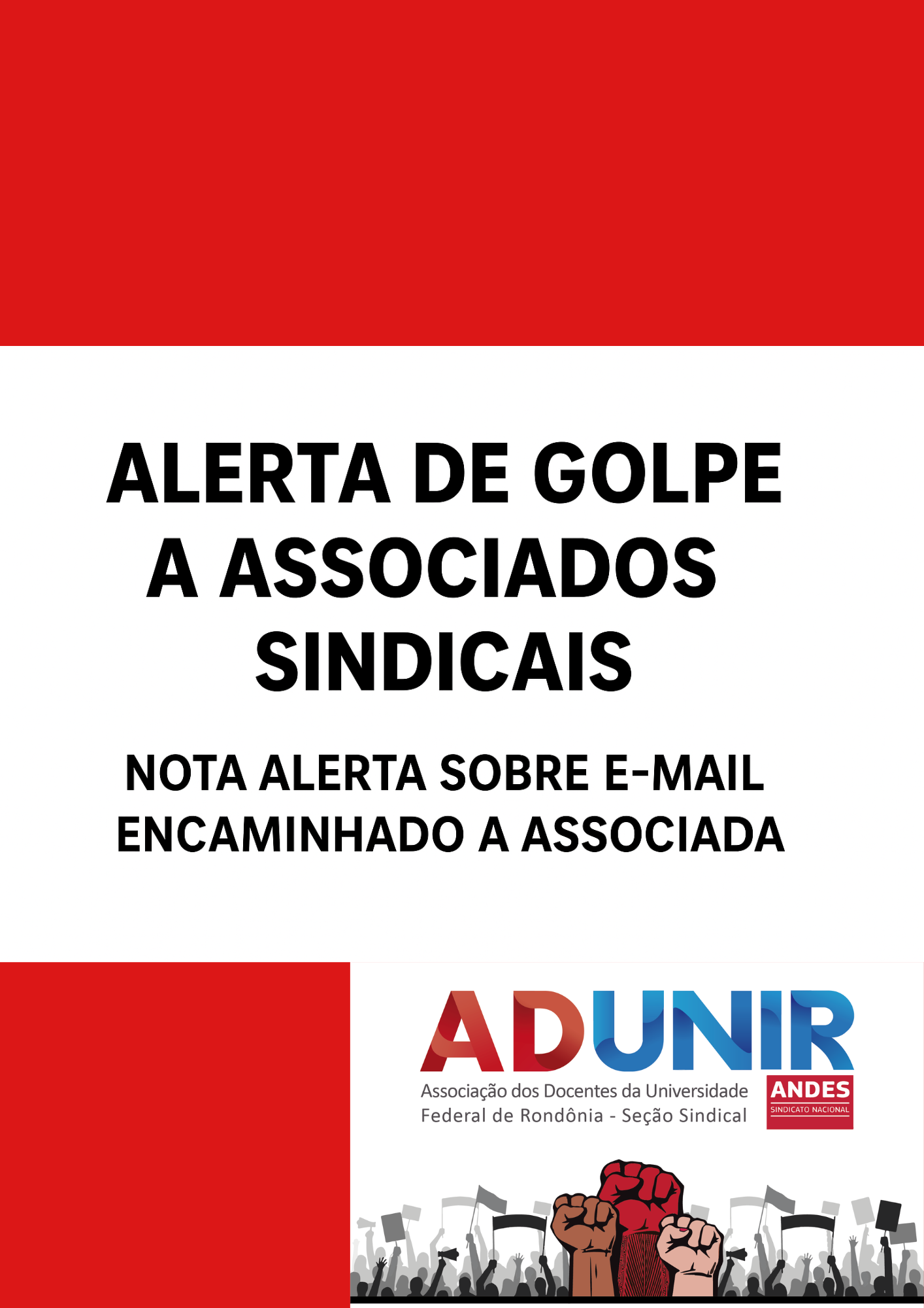 Caso você tenha recebido essa mensagem, não clique em links, não responda e não forneça dados pessoais. Em caso de dúvida, entre em contato diretamente com a ADUNIR pelos canais oficiais.