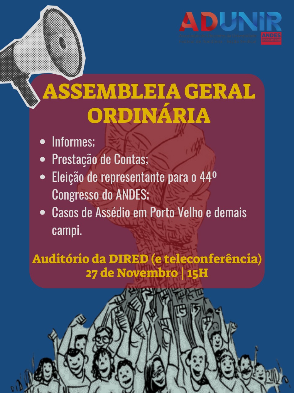 A ADUNIR – Seção Sindical do ANDES-SN – convoca todas e todos os docentes sindicalizados para a Assembleia Geral, a realizar-se no dia 27 de novembro de 2025 (quinta-feira), às 15h, por teleconferência, conforme previsto no Estatuto do ANDES-SN.